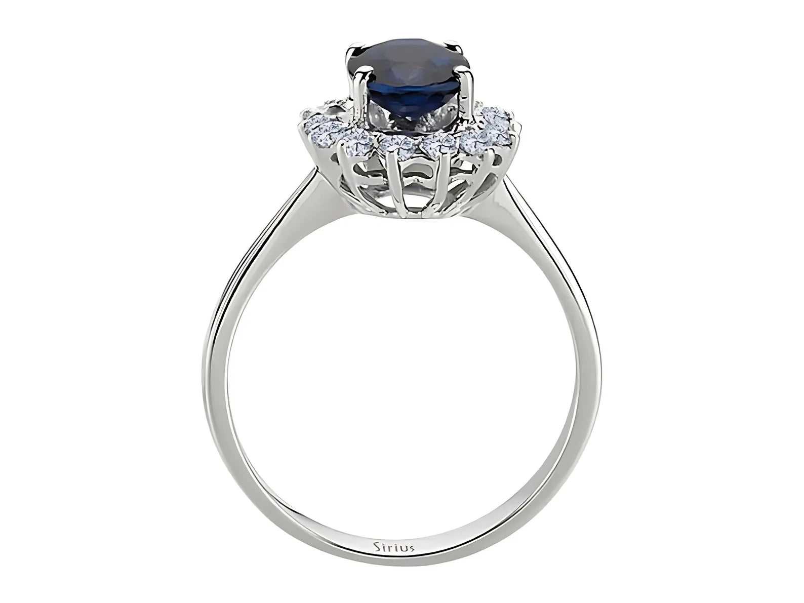 Timeless and elegant, the Mirabilis Sapphire Ring is a true statement of sophistication. Inspired by the Victorian era, this exquisite piece features a 1.36-carat oval-cut blue sapphire. Surrounding the center stone is a delicate halo of 14 round-cut diamonds (totaling 0.37 carats), adding shine and refinement to the ring.