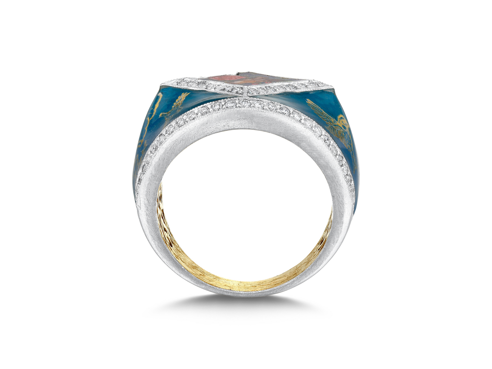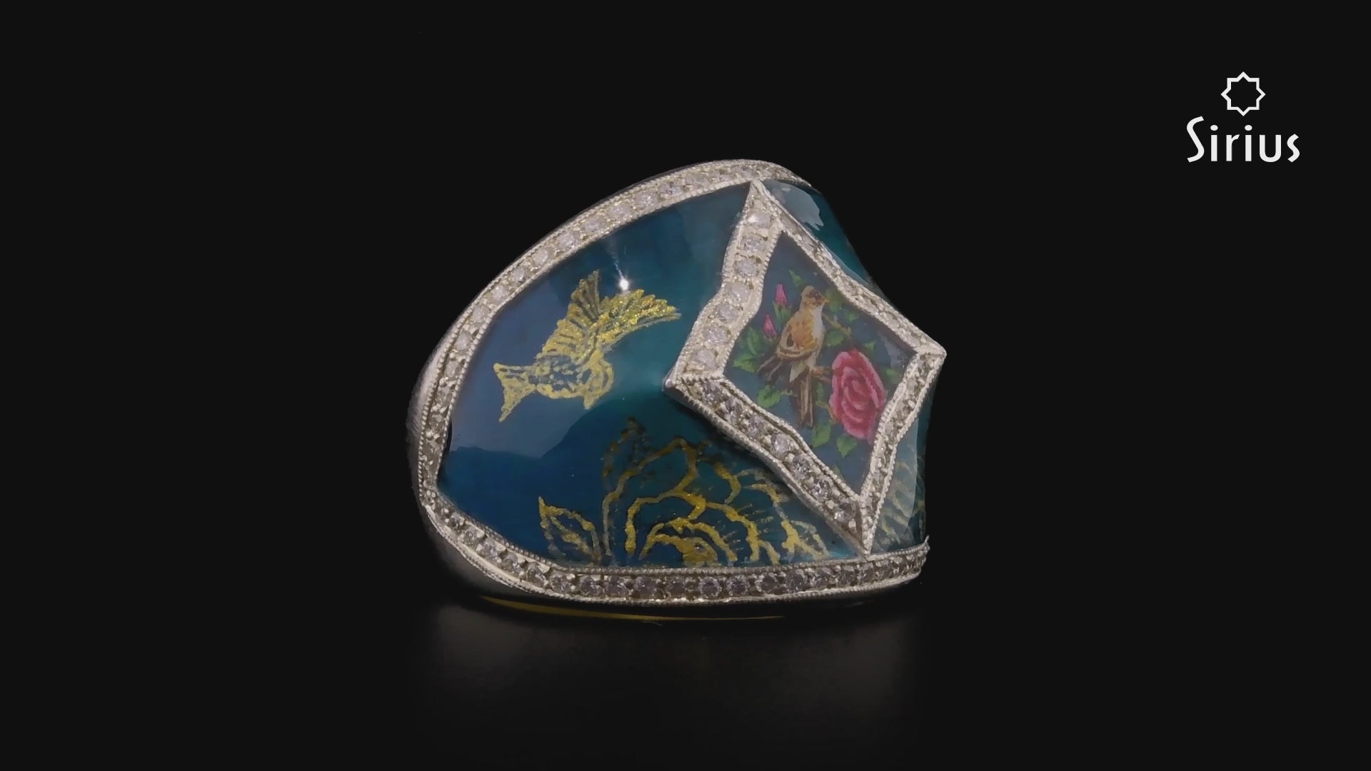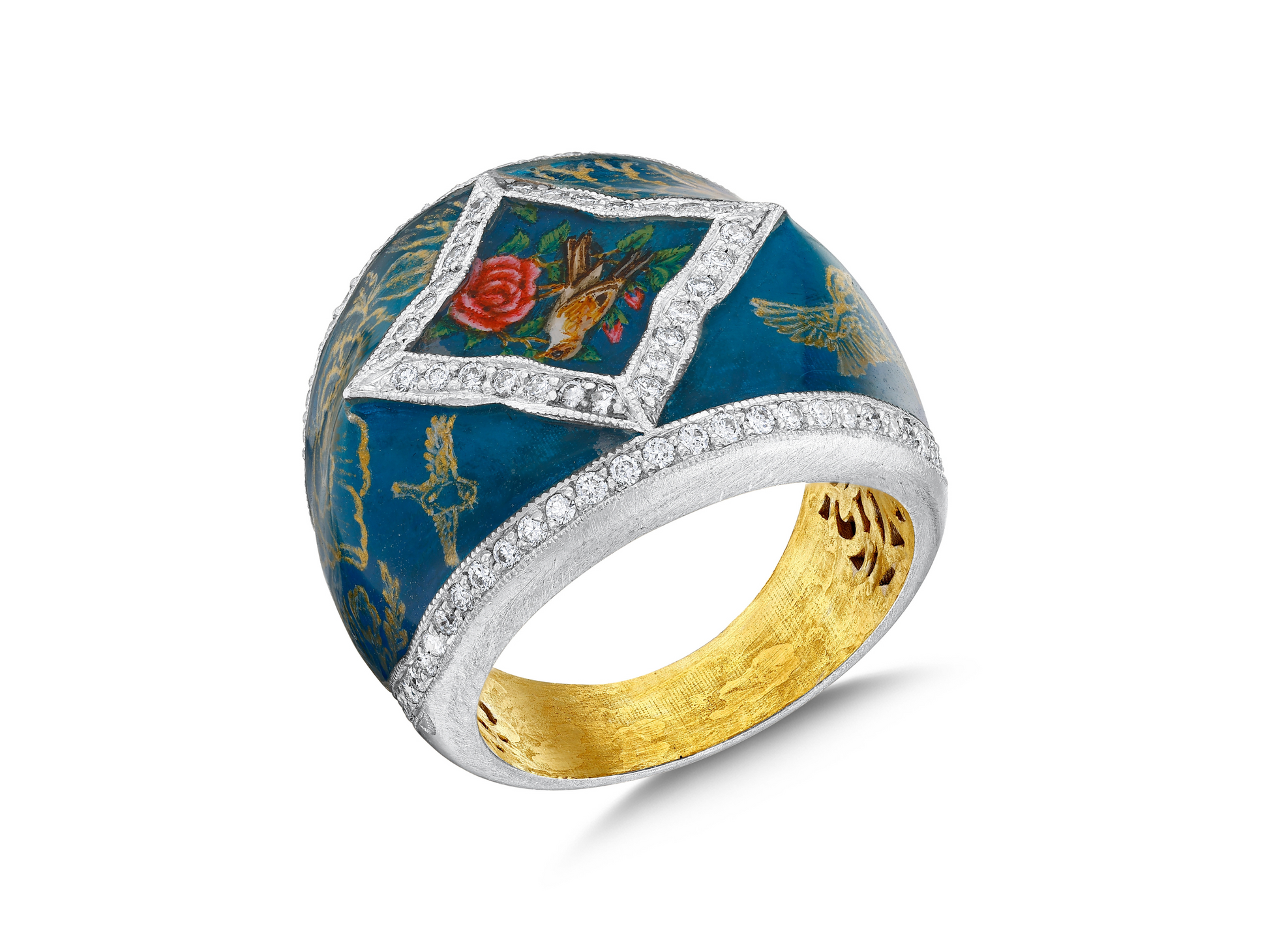 This sophisticated ring features a delicate bird motif hand-painted to perfection. A fusion of diamonds, 24k gold, and 925 sterling silver, the Pastoral Artisanal Ring is a true statement piece. All of our rings are made-to-order. Gemstone Information Diamond |